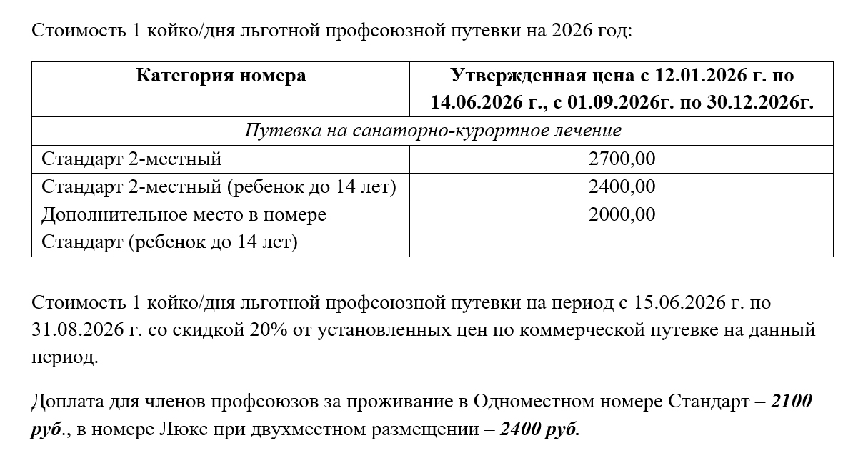 Цены для членов профсоюзов в Санаторий имении Станко на 2026г.