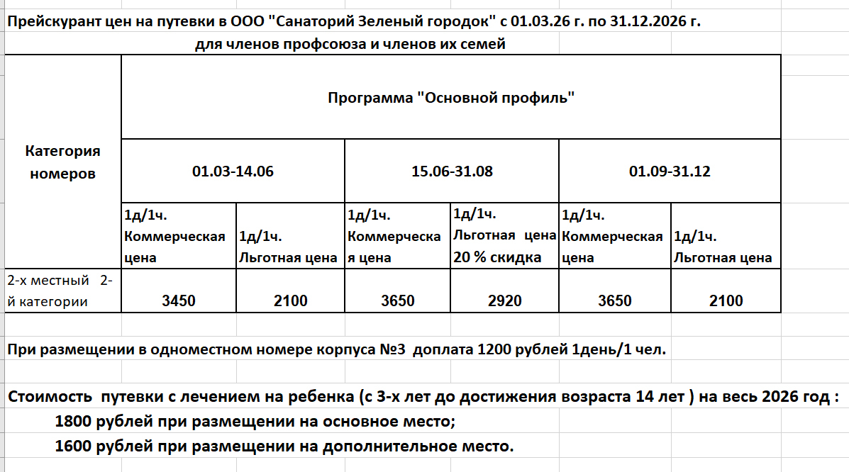 Цены для членов профсоюзов в Санаторий Зеленый городок на 2026г.
