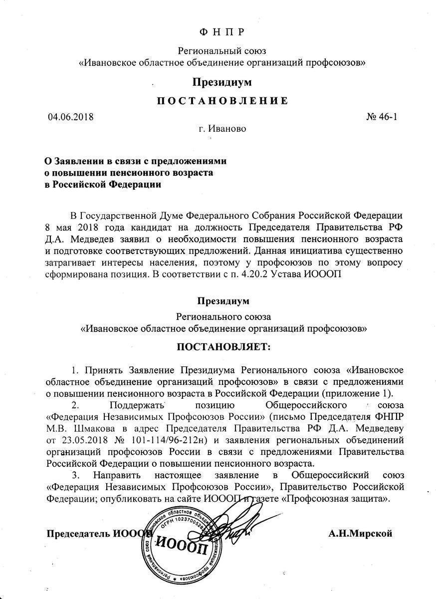 Письмо Председателю Правительства Российской Федерации Д. А. Медведеву "О позиции профсоюзов по вопросу повышения пенсионного возраста" от 5 июня 2018г. читать: