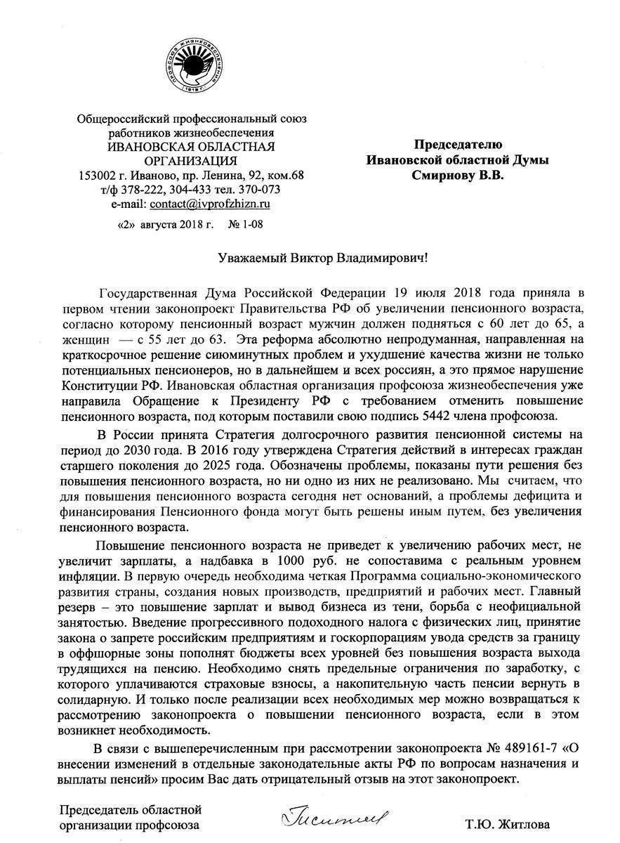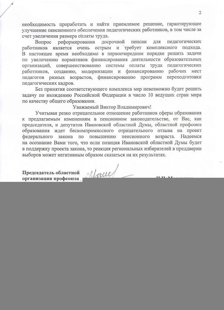 Обращение Президиума областного комитета профсоюза работников народного образования и науки Российской Федерации «О позиции Ивановской областной организации профсоюза работников народного образования и науки РФ по вопросу повышения пенсионного возраста в Российской Федерации» - Председателю Ивановской областной Думы В.В. Смирнову читать: документ 1 документ 2