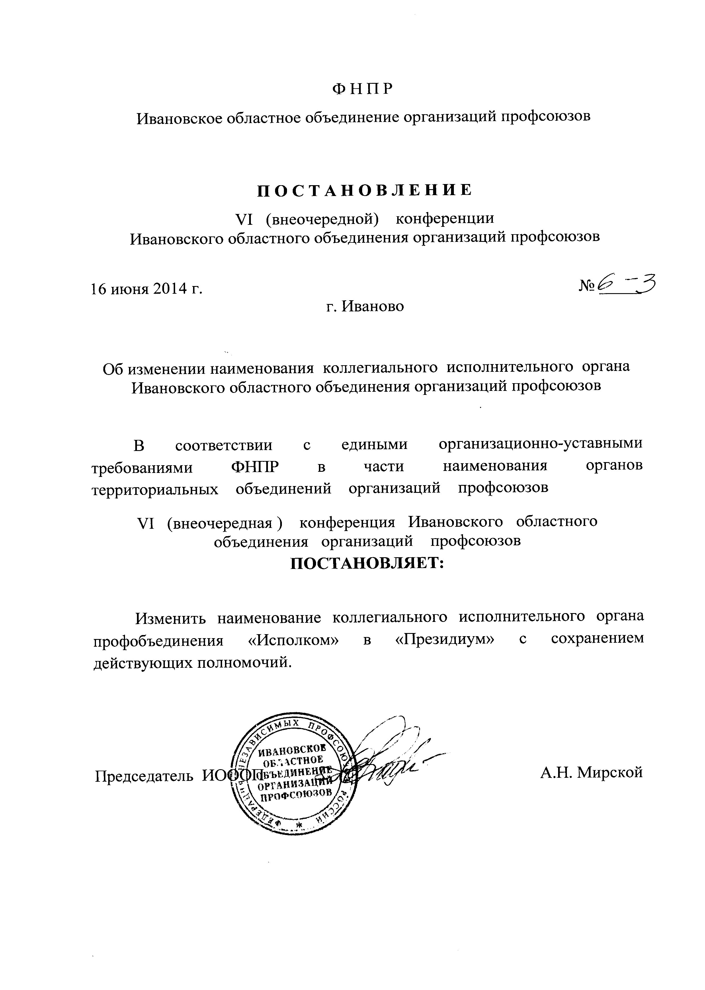 - Об изменении наименования коллегиального исполнительного органа Ивановского областного объединения организаций профсоюзов