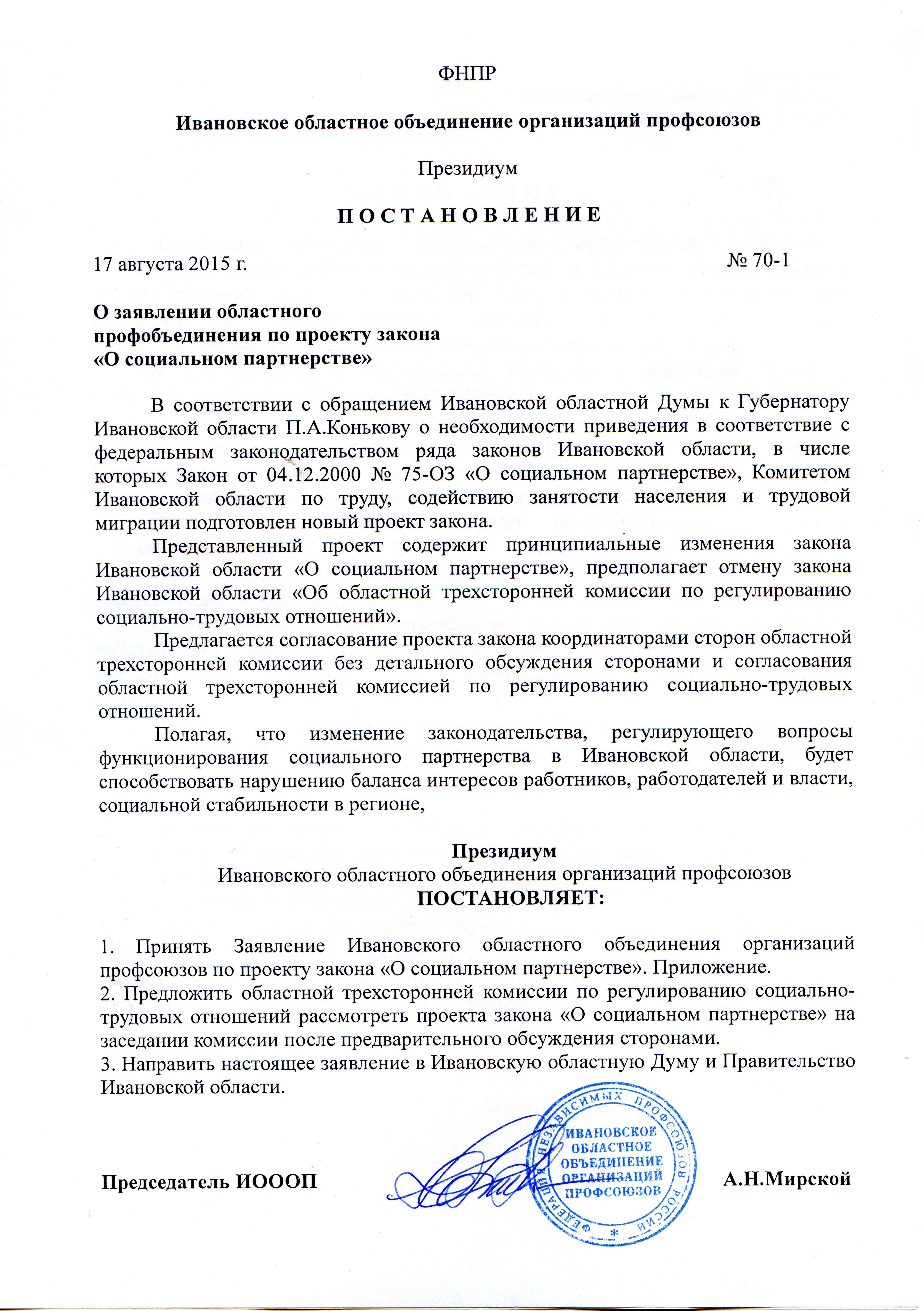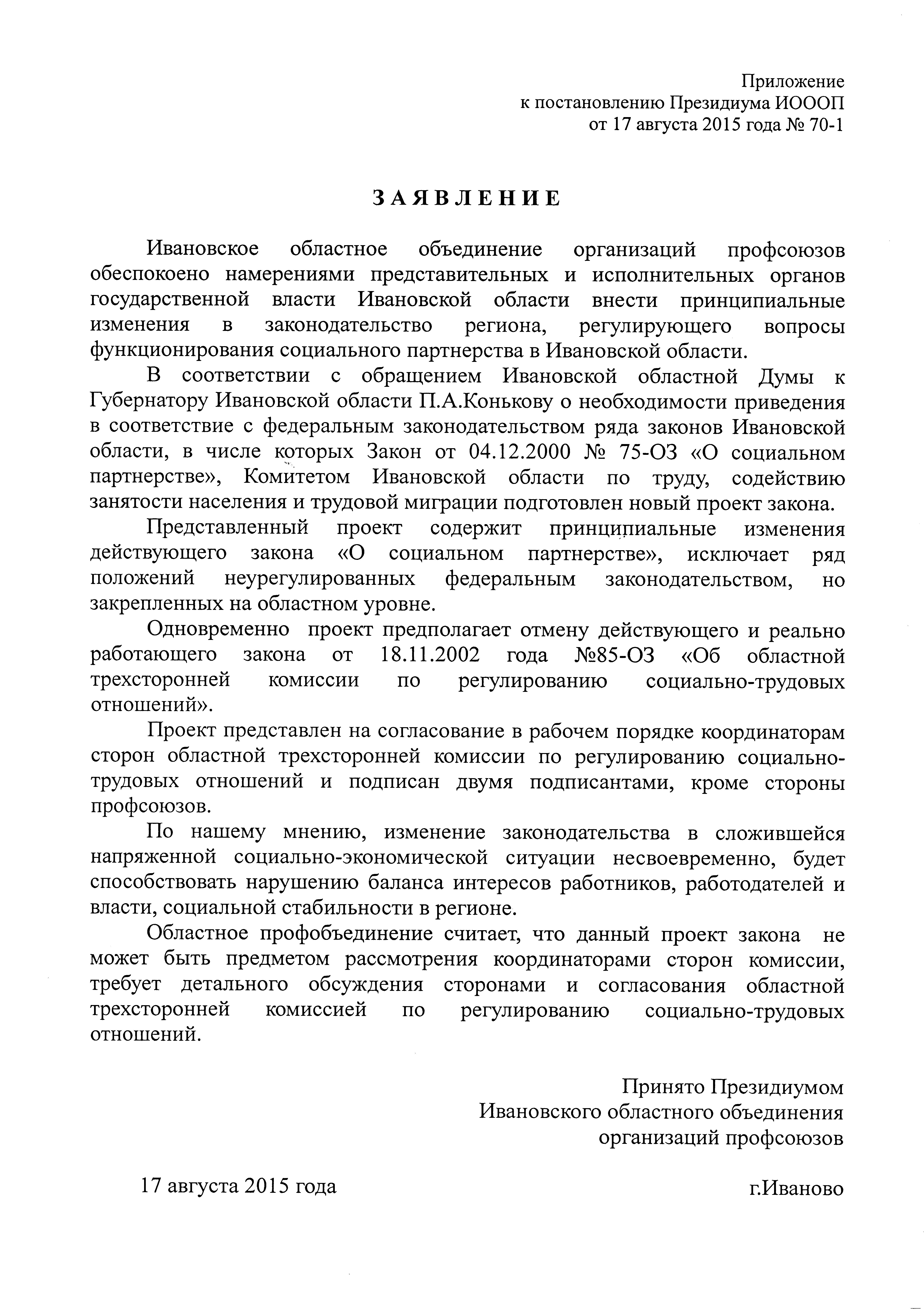 70-1 О заявлении областного профобъединения по проекту закона "О социальном партнерстве"