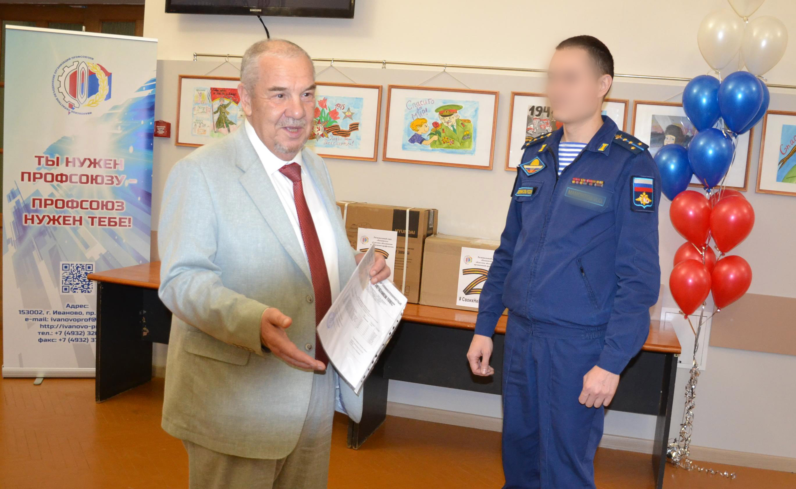 В зале ивановского Дома Профсоюзов председатель Ивановского профобъединения Александр Мирской в присутствии профсоюзных активистов передал пакет гуманитарной помощи ивановской военной части.