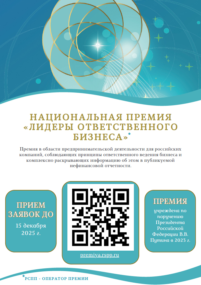 До 10 декабря открыт прием заявок на участие в Национальной премии «Лидеры ответственного бизнеса». Премия учреждена по поручению президента России в 2023 году и проводится Российским союзом промышленников и предпринимателей.