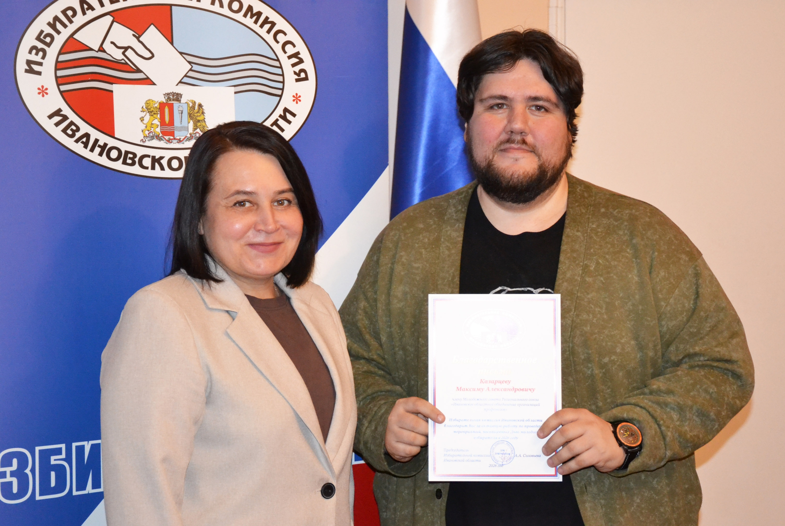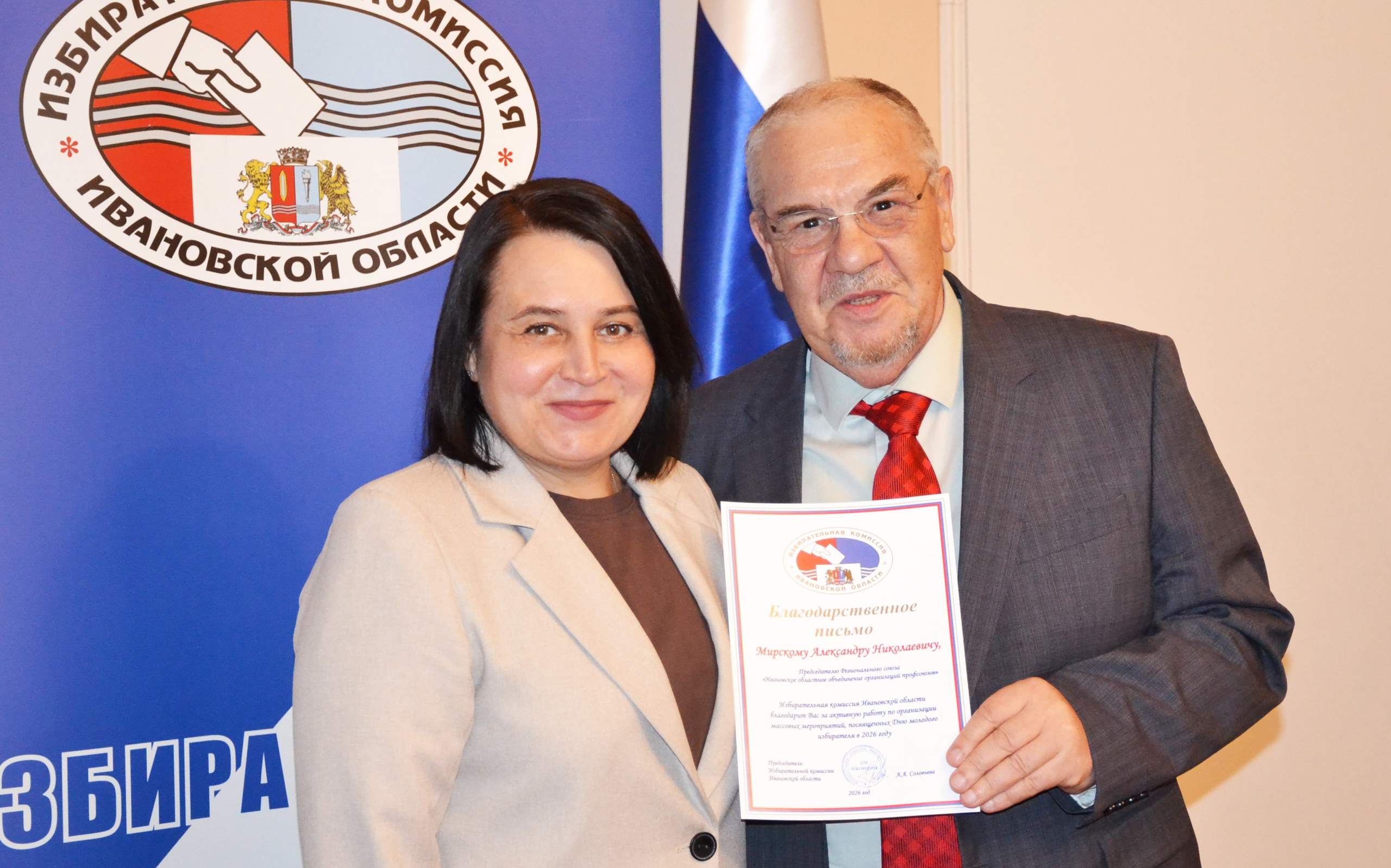 Руководитель ИОООП наградил за активную работу по организации мероприятий ко Дню молодого избирателя Татьяну Синяткину, Елену Фиохину, Елену Частухину, Владимира Смирнова и Романа Курочкина. Сам Александр Мирской, а также Максим Казарцев, Андрей Блинов и другие профактивисты были отмечены за активную работу профсоюзов благодарственными письмами облизбиркома.