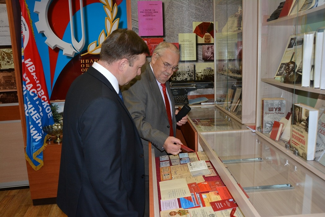 Гости также осмотрели музей профсоюзов. В этом году Ивановское профобъединение отмечает 120 лет деятельности по защите прав трудящихся. Сергей Низов отметил, что у «Единой России» в этом году тоже значимая дата – 25 лет со дня основания.