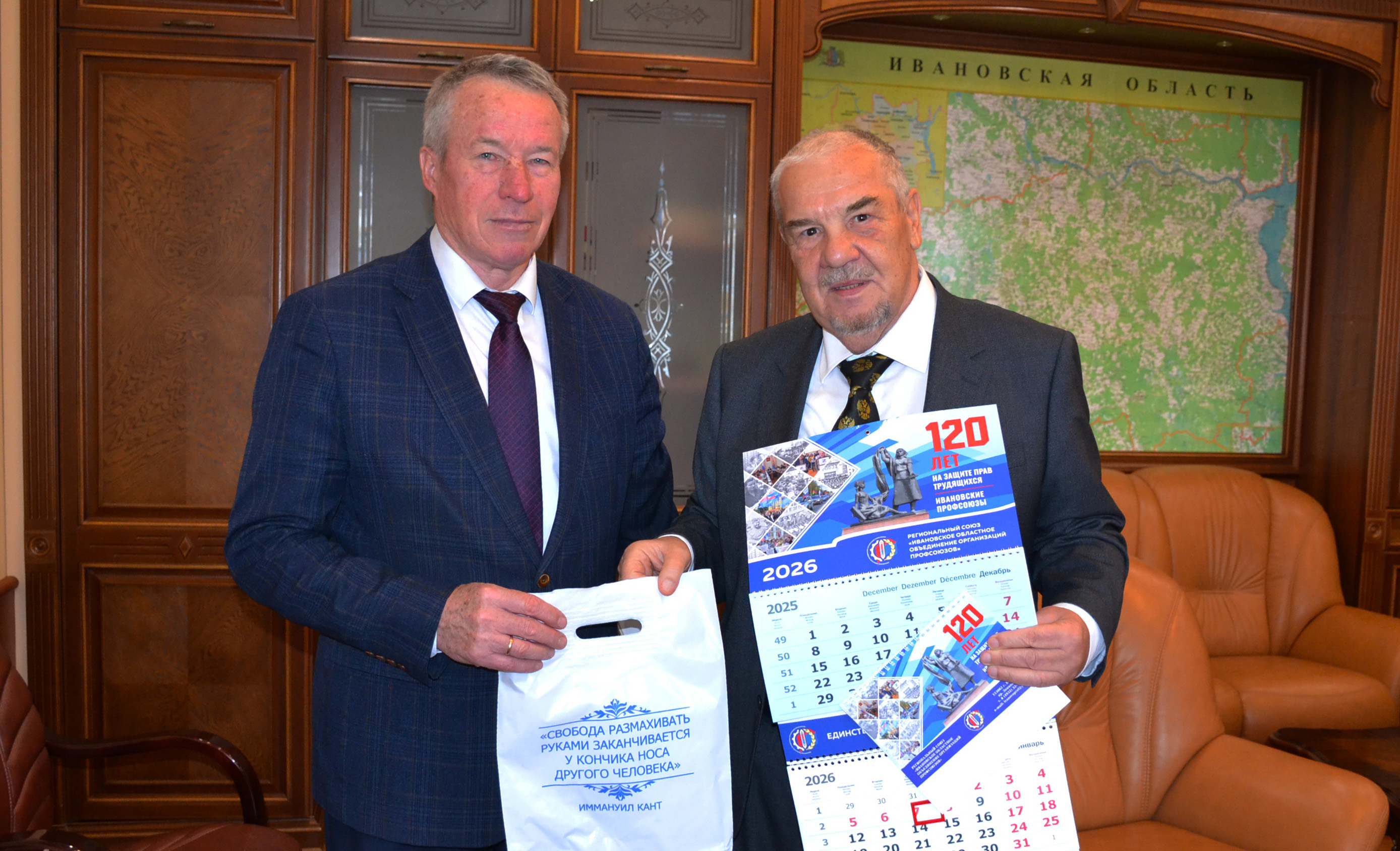 Председатель ИОООП Александр Мирской с благодарностью принял бесценный презент с автографом автора и свою очередь подарил верному другу ивановских профсоюзов сувениры от Ивановского профобъединения. Стороны обсудили дальнейшую совместную работу по продвижению и закреплению исторической памяти в обществе.