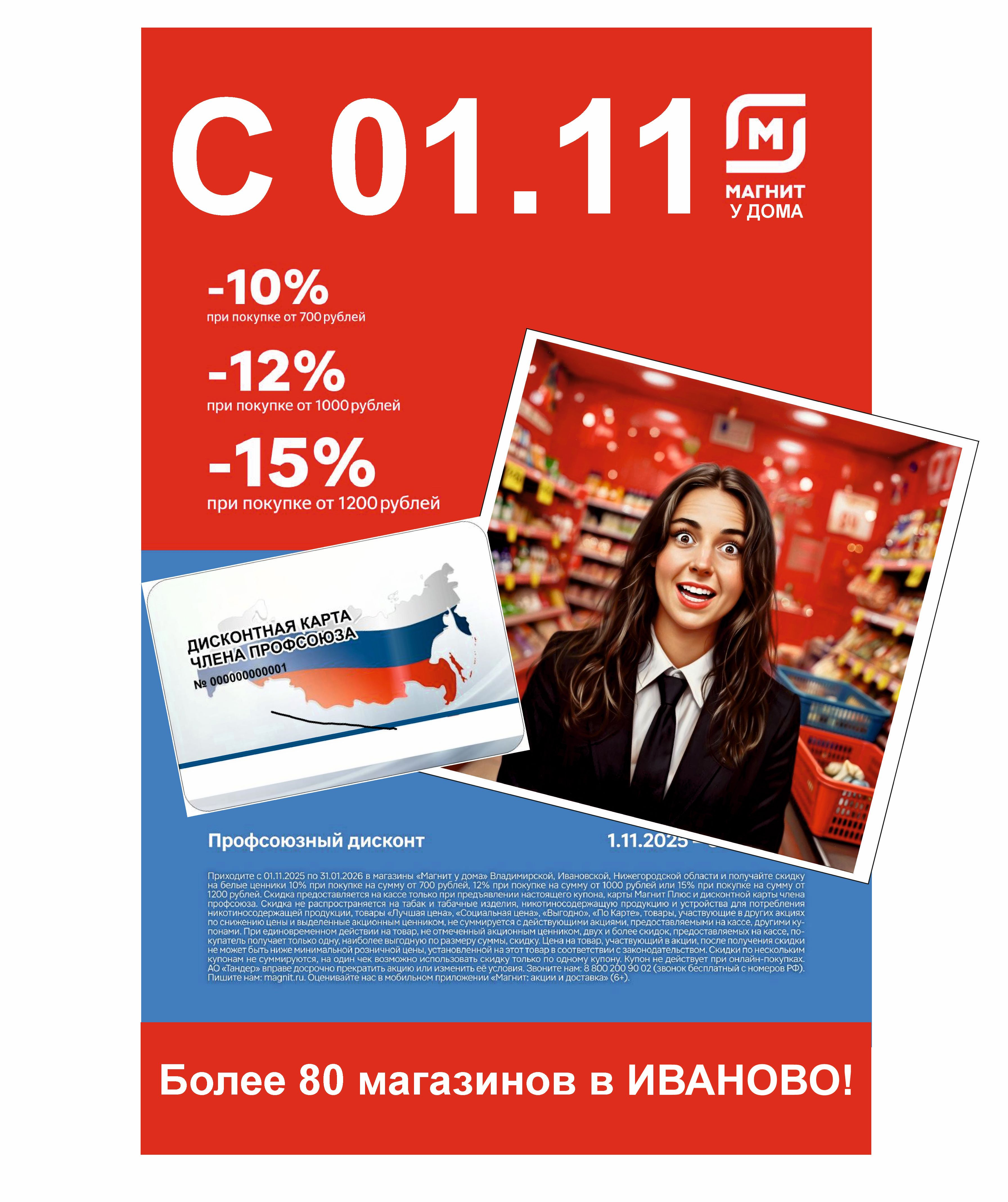С 1 ноября 2025 г. до 31 января 2026 г. владельцы карт «ПрофДисконт» могут получить скидки от 10 до 15% в сети магазинов «МАГНИТ у дома».