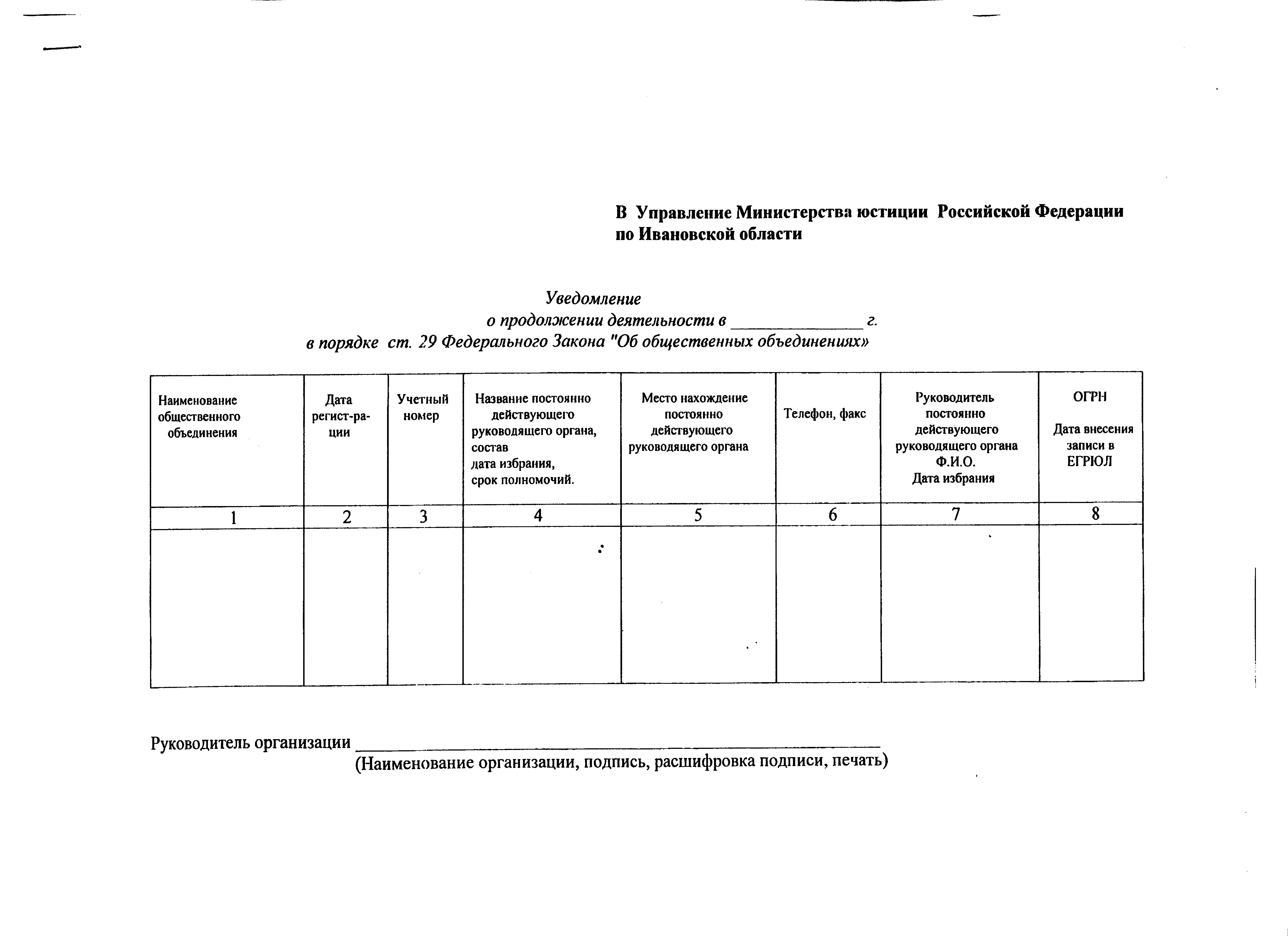 Управление Министерства юстиции Российской Федерации по Ивановской области напоминает,  что в соответствии с  частью 1 статьи 29 ФЗ «Об общественных объединениях» профсоюзные организации  обязаны ежегодно информировать орган, принявший решение  о государственной регистрации общественного объединения, о продолжении своей деятельности с указанием действительного места  нахождения постоянно действующего органа, его названия и данных о руководителях  общественного объединения в объеме сведений, включаемых в единый  государственный реестр юридических лиц.