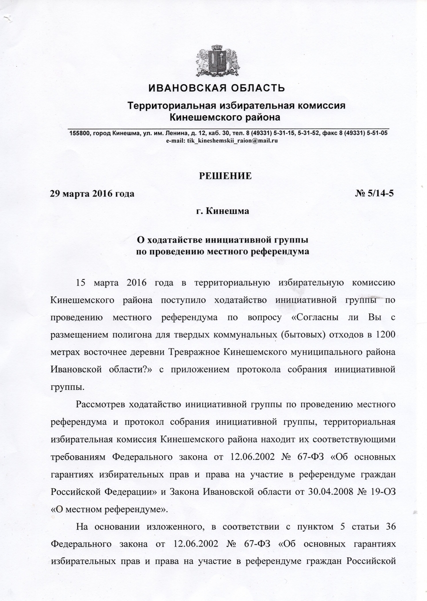 Территориальная избирательная комиссия Кинешемского района. Решение о ходатайстве инициативной группы по проведению местного рефередума. читать лист1 лист2