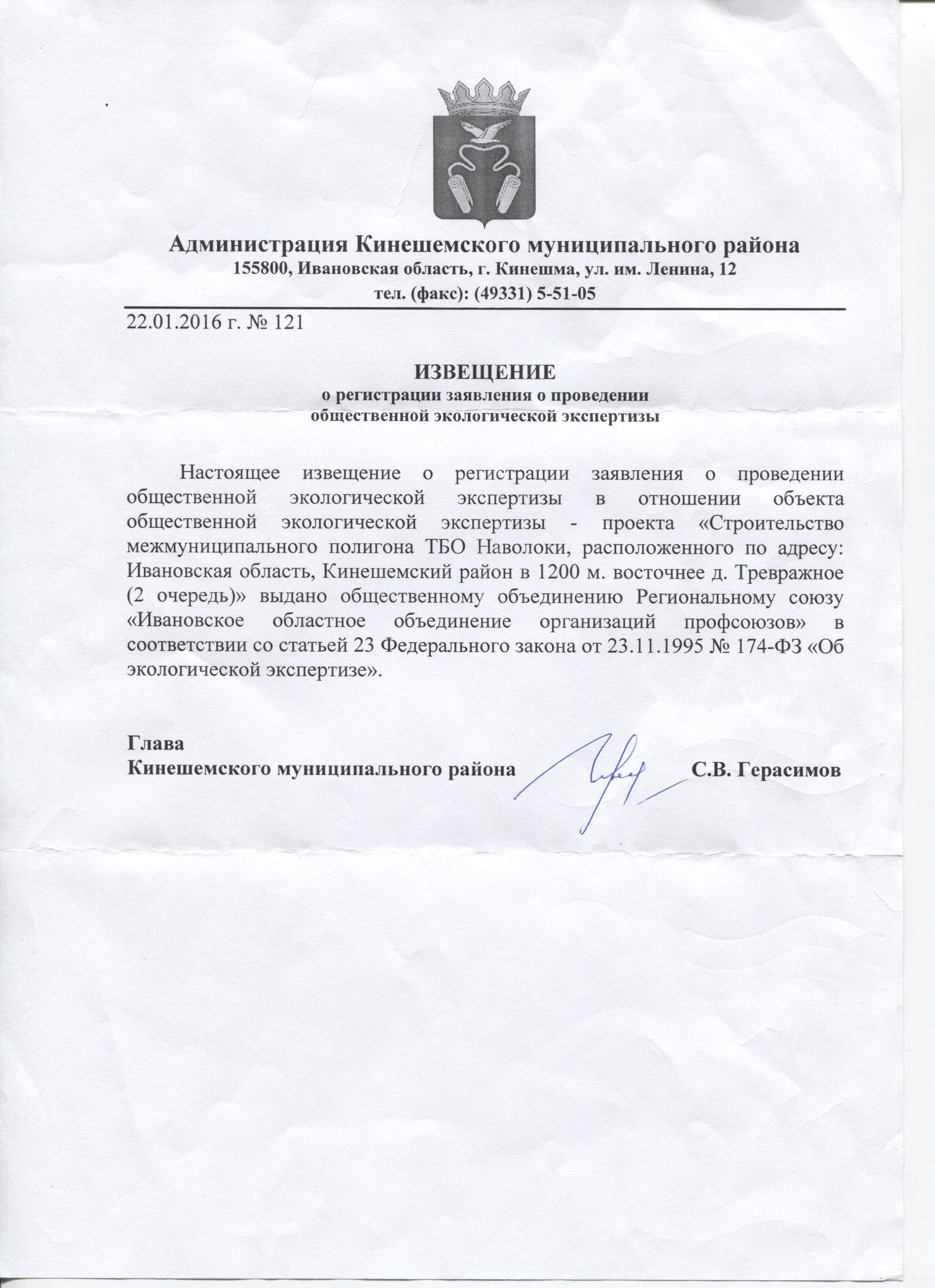 Извещение о регистрации заявления о проведении общественной экологической экспертизы.