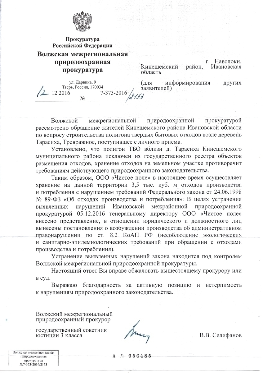 Ответ Ивановской межрайонной природо-охранной прокуратуры от 16 марта 2016 года.