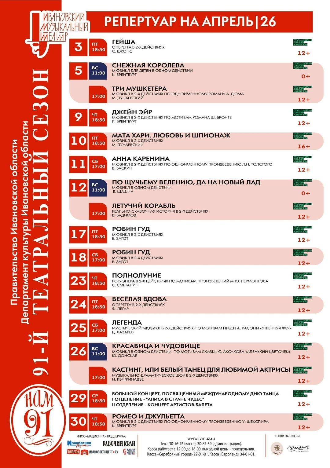 Афиша Ивановского музыкального театра на апрель 2026 года.
