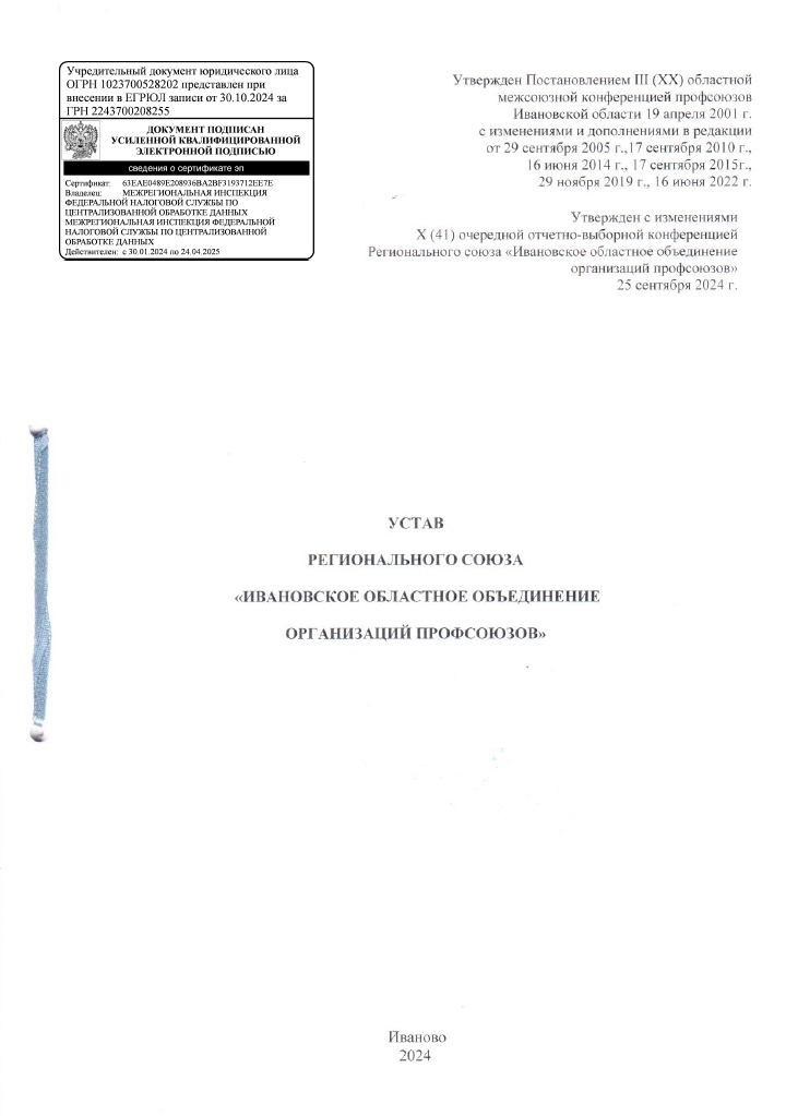 УСТАВ РЕГИОНАЛЬНОГО СОЮЗА «ИВАНОВСКОЕ ОБЛАСТНОЕ ОБЪЕДИНЕНИЕ ОРГАНИЗАЦИЙ ПРОФСОЮЗОВ
